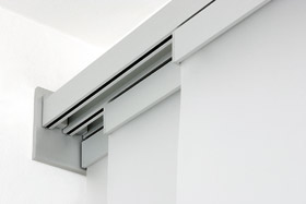 Eine sehr dekorative Variante der Flächenvorhang Befestigung sind mehrspurige Innenlaufsysteme. Dabei handelt es sich um schmale, parallel zueinander angeordnete Aluminiumstangen, die mit einem Innenlauf versehen sind. Die Schienenstangen können durch einen speziellen, unauffälligen Schienenträger an der Wand oder an der Decke befestigt werden.